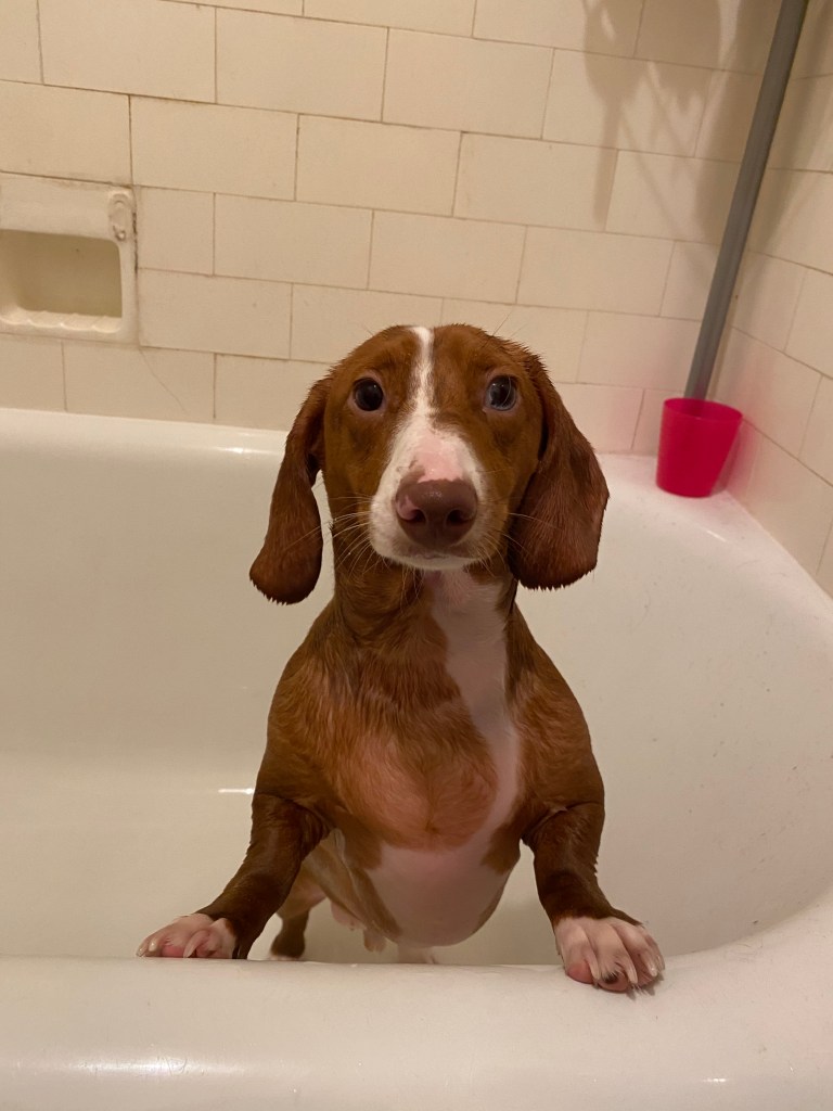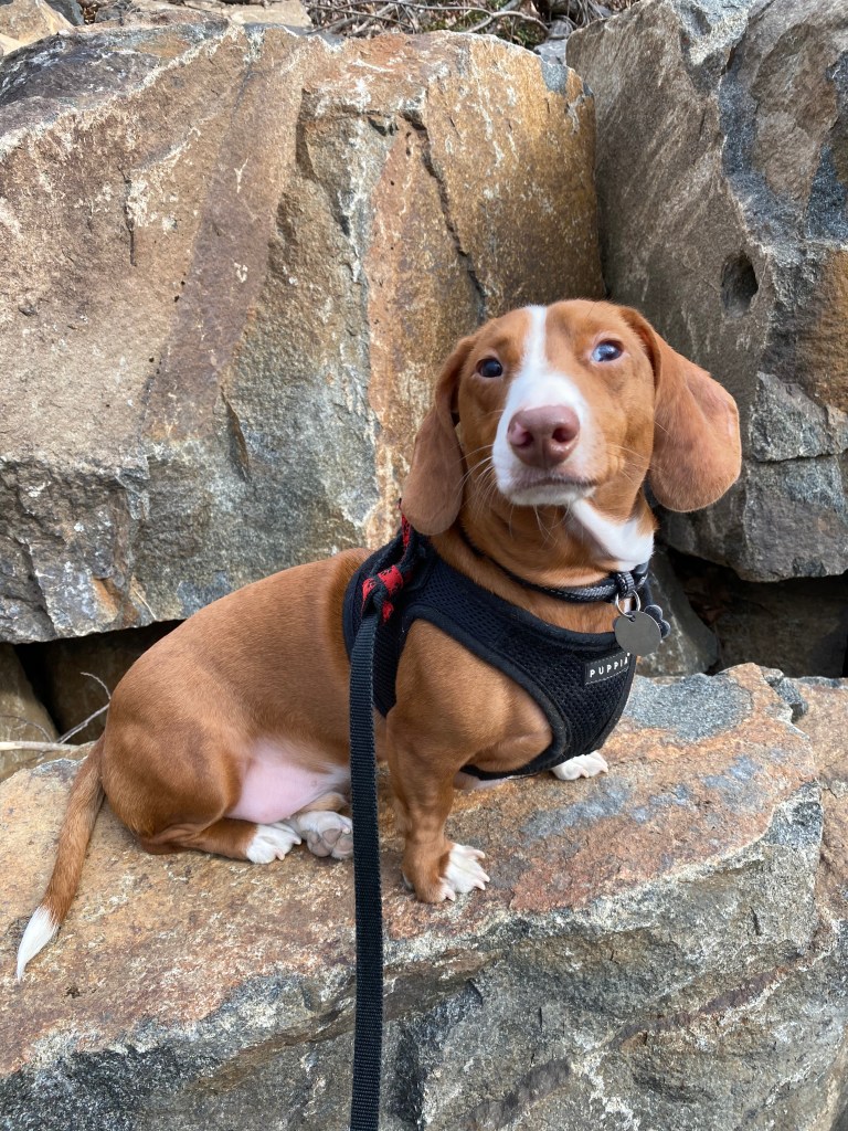 I have a dachshund named Herman. He’s 17 pounds of double dapple short-haired red with white flash on the back of his neck and a white stripe from his foreheard to his nose, white booties on his feet, and a white tip of his tail that makes his tail look like a paintbrush. His double-dapple darker spots are hard to see but shine brightly (darkly?) in full sunlight.