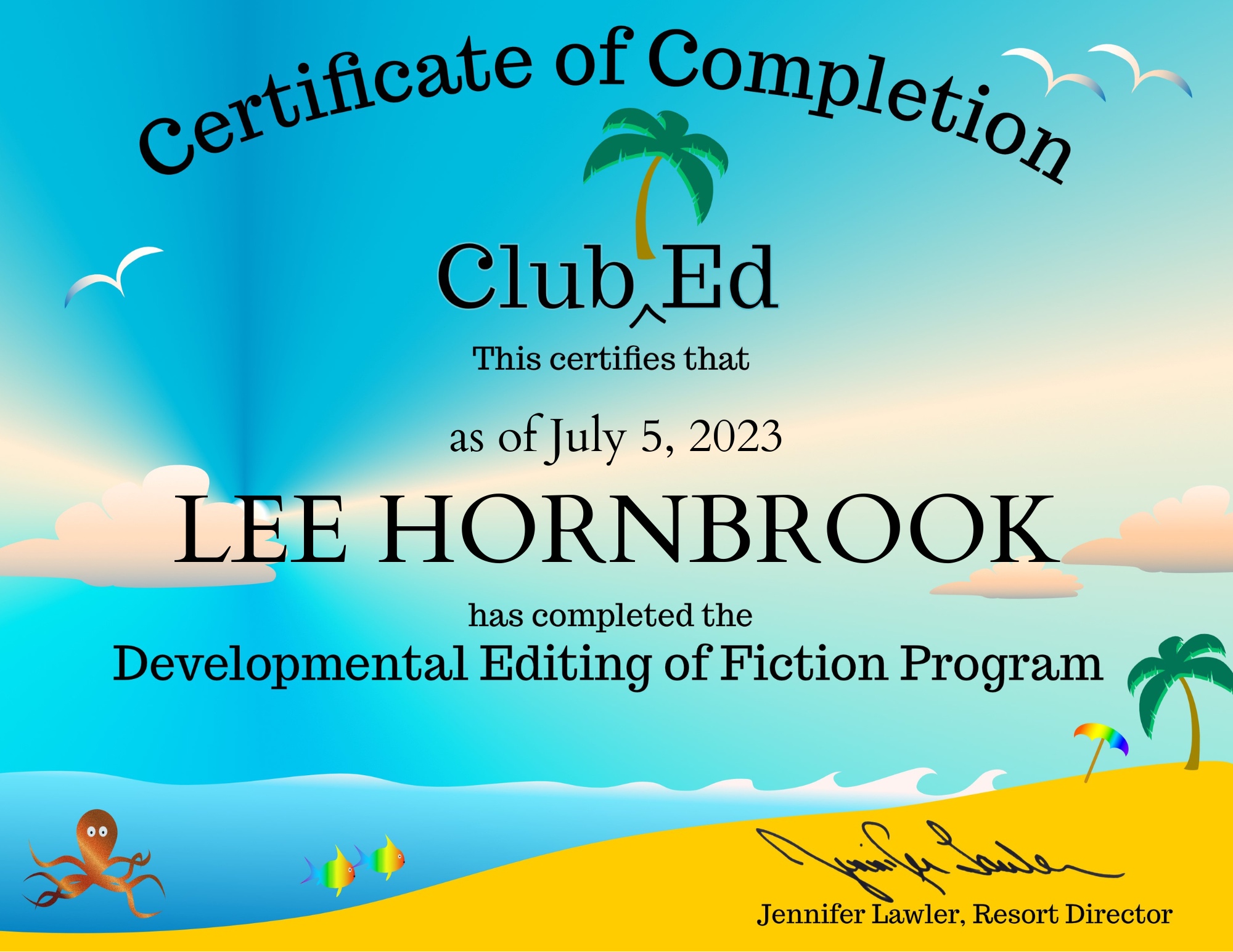In July 2023, I earned a Certificate of Completion in Developmental Editing of Fiction from Club Ed Freelancers.